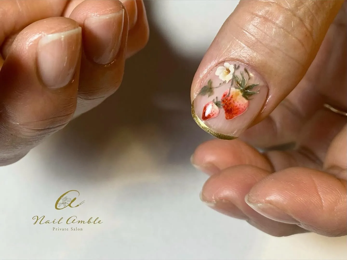 可愛い!いちごモチーフのネイル 2025/04/02 あっという間に4月に突入ですね。 気づいたら2025年も4分の1が終了です。 可愛いいちごの季節ももう過ぎ去ってしまいそうで、慌ててブログにアップしています(汗) こちらは、赤い実に葉っぱに白い花まで。 全部を親指に取り込みましたよ。 しかし、、、いちごって、どうしてこんなに絵になるのでしょうね〜。 果物を“可愛い”って感じるのは、なぜなのでしょうね〜。 と、毎年思いながら、この季節になるといちごをモチーフにしたネイルデザインをすることが多いです。 リアルないちごを描くのも好きですが、こんなバージョンも好き♡↓ 北欧柄みたいに可愛らしく、でも子どもっぽくなりすぎないようにシックな色合いで仕上げました。 こちらもとっても好評でしたよ。 季節の移り変わりとともに、ネイルデザインもほんの少し先取りで変わっていきますよ。 お客様からのオーダー、これからもとても楽しみです! もちの良いジェルを松山市で体験 松山市で手書きアートをオーダー ジェル アート